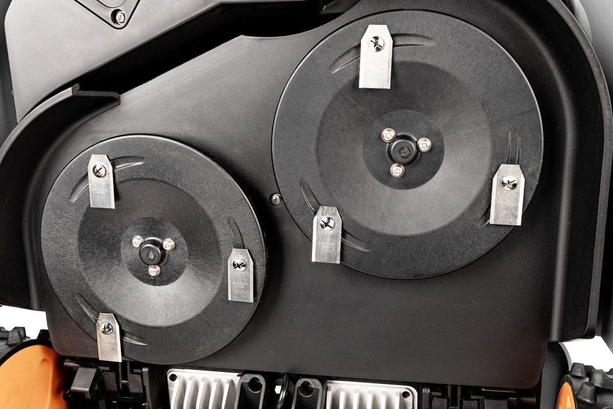 Dwa dyski tnące z trzema wahliwymi nożykami każdy oraz automatyczna regulacja wysokości koszenia z poziomu aplikacji.