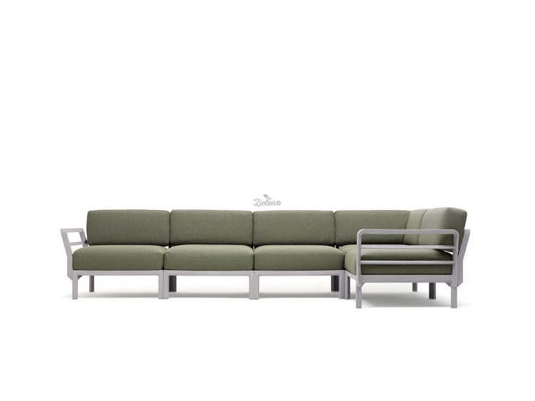 - komplet mebli włoskich do ogrodu z pięcioma siedziskami ze stelażem w kolorze Gesso i poduszkami w kolorze Timo