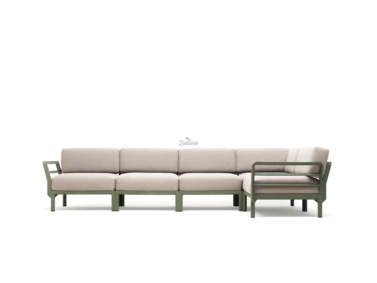 - komplet mebli włoskich do ogrodu z pięcioma siedziskami ze stelażem w kolorze Cactus i poduszkami w kolorze Perla