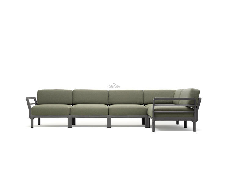 - komplet mebli włoskich do ogrodu z pięcioma siedziskami ze stelażem w kolorze Basalto i poduszkami w kolorze Timo